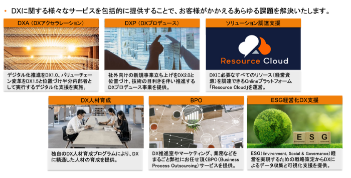 DXアドバイザリからソリューション調達、IT導入支援からIoTでの見える化まで、DX推進に必要なあらゆるリソースを提供することで企業の変革を支援することです。