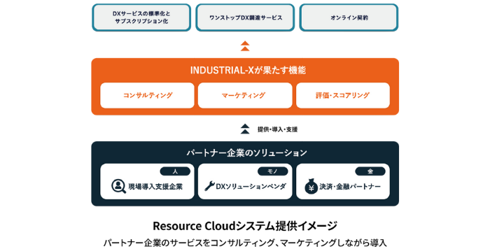 INDUSTRIAL-Xは、企業が目指すべき新たなビジネスモデルの構築アドバイザリから、Resource Cloudを活用したソリューション調達、導入支援、DX人材育成、BPO(広報・マーケティング支援)といった、アドバイザリから実行までを一気通貫して支援しています。