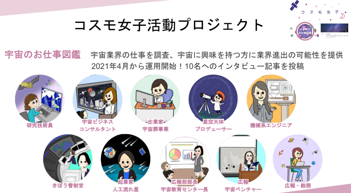 そのようなイベントを通じて宇宙の知識を身につけながら、宇宙業界で働く女性を紹介する「宇宙のお仕事図鑑」などのWebメディアの運営、zoomで体験できる宇宙旅行「バーチャル宇宙旅行」の企画運営など様々なプロジェクトを推進しています。