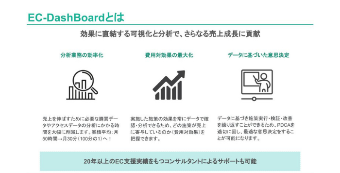 「EC-DashBoard」を導入することにより、分析にかかる時間が大幅に減り、見るべき指標を一元的に可視化して、EC売上を伸ばすための素早い意思決定を可能にします。
