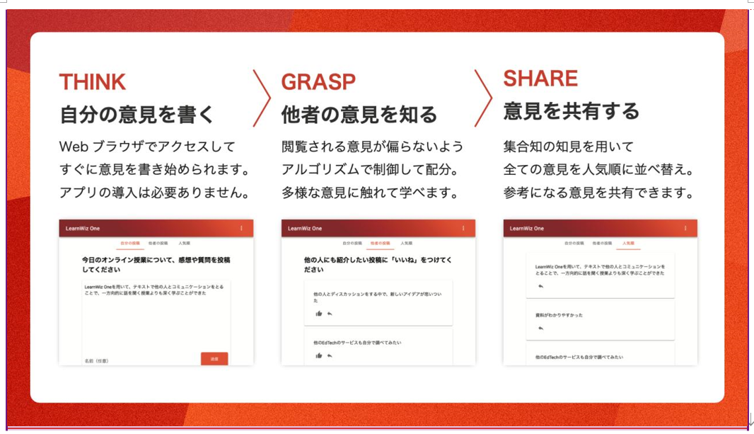 「LearnWiz One」は、参加者の主体性を引き出しながら、効果的な意見交換を促すことができるWebツールです。本ツールを授業やイベント、研修で活用することにより、参加者同士で学び合う環境を容易に作り出すことができるだけでなく、参加者も他の人との意見交換を楽しみながら深い学びを得ることができます。コロナ禍における授業のオンライン化を背景に、教育工学を専門とする東京大学工学系研究科の吉田塁准教授とともに開発を始めました。