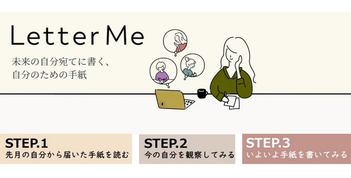 「LetterMe」は、毎月1回翌月の自分宛てに手紙を書くことで、自分フルネスに日々を過ごすことをサポートするサービスです。