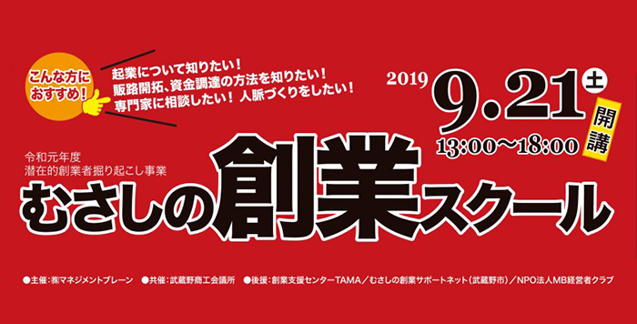 株式会社マネジメントブレーンは9月21日(土)より全4回にわたり「むさしの創業スクール」を開講します。