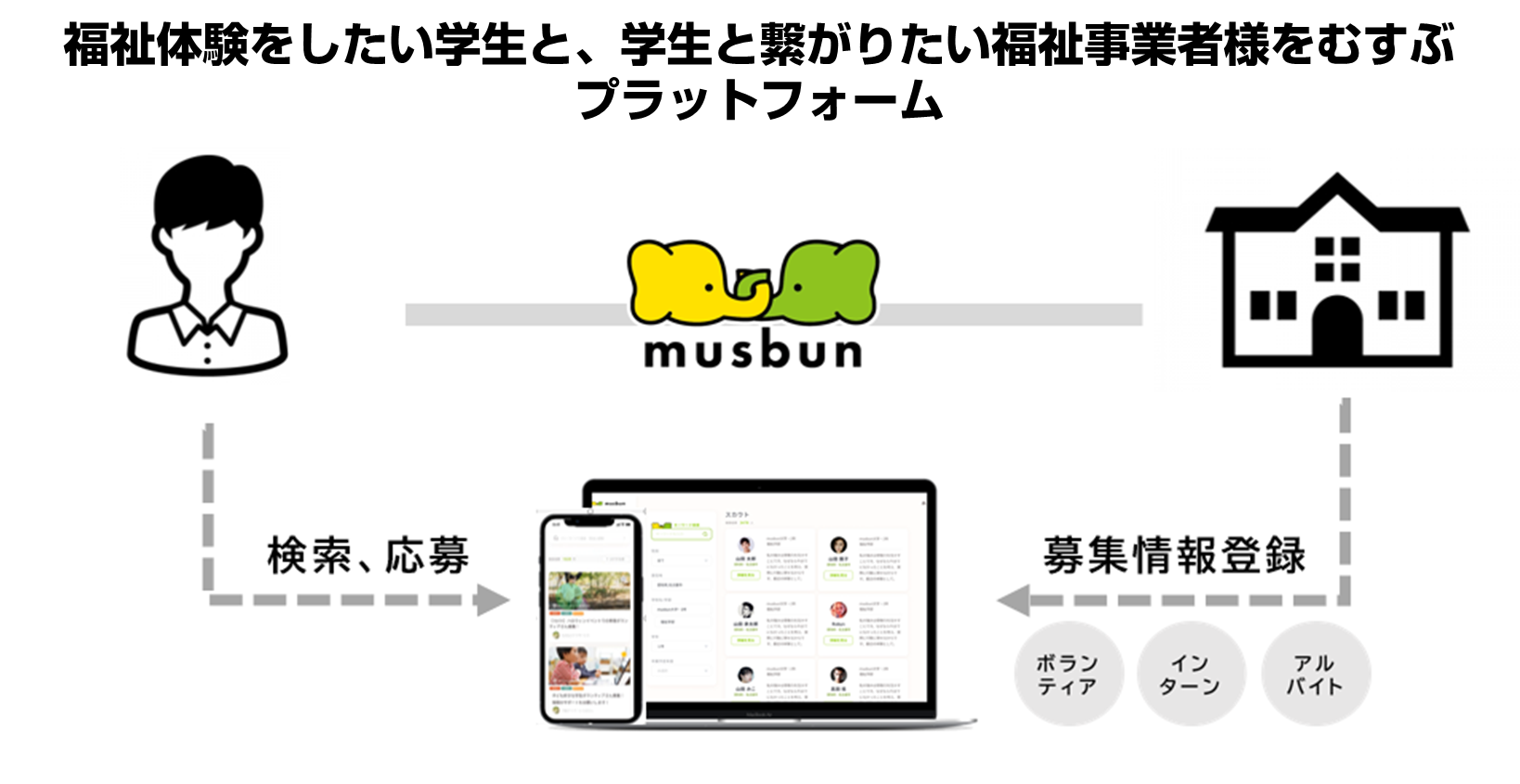 まだスタートしたばかりですが、学生からは「musbunを通じて福祉体験に踏み出すことができた」「福祉の魅力に気づけた」、福祉事業者様からは「musbunのお陰で、今まで出会えなかったような学生と接点が増えている」「学生が施設に来てくれるだけで雰囲気が明るくなり、笑顔が増える」という声も頂き、手応えを感じ始めています。
