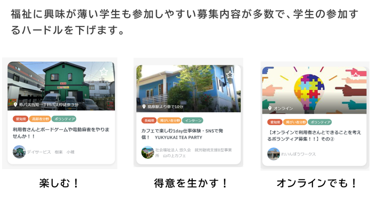 株式会社musbunの事業の特徴は、提供している情報が「求人」ではなく「福祉体験」であることで、福祉を学んでいない学生でも関わりやすい、福祉施設でのレクリエーションのお手伝いや、オンラインを使った傾聴ボランティア、ウォーキングの付き添いなど、福祉というよりも自分の得意なことが活かせる募集を掲載し、応募への心理的ハードルを下げ、実際の福祉体験で福祉に興味を持つきっかけを提供しているという点です。