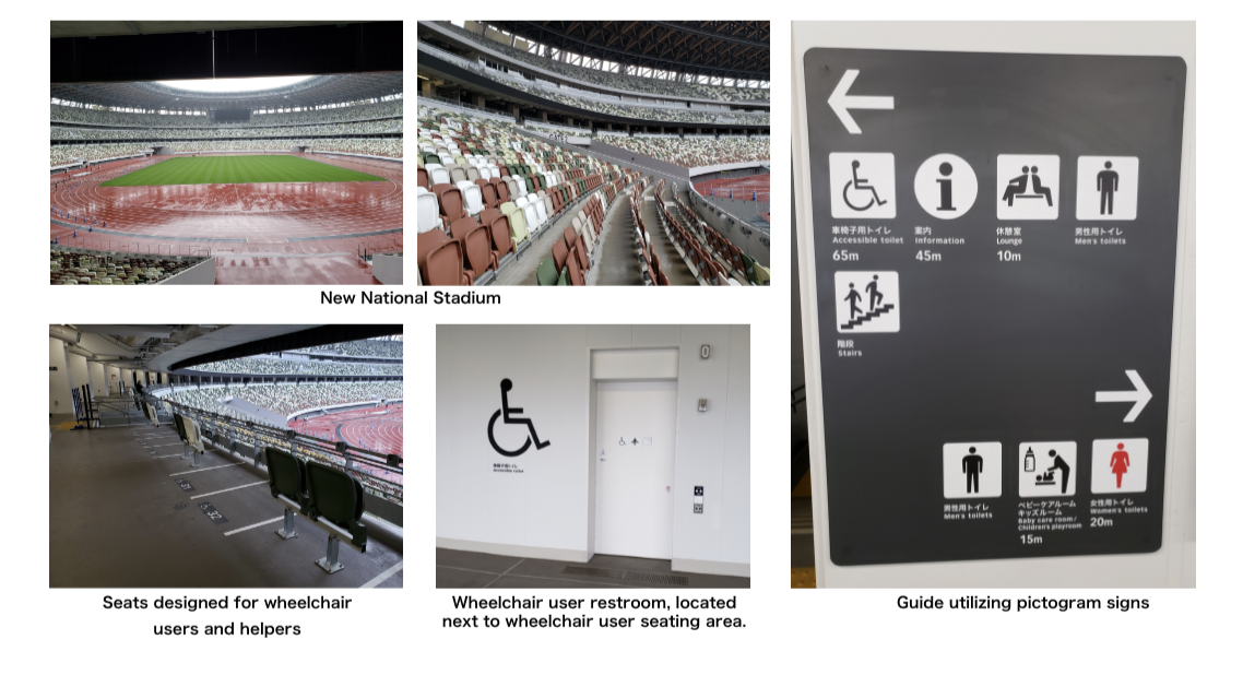 ユニバーサルデザイン(UD)は米国のロナルド・メイス氏が1985年に「UDの7原則」を提唱したのが始まりです。内容は(1)どんな人でも公平に使えること (2)使う上での柔軟性があること(3)使い方が簡単で自明であること(4)必要な情報がすぐに分かること(5)簡単なミスが危険につながらないこと(6)身体への過度な負担を必要としないこと(7)利用のための十分な大きさと空間があること、を掲げています。概念的なものですが、日本では汎用性と多様性があることから、日本では2020東京オリンピック・パラリンピックの新国立競技場で本格的に導入されました。広い競技場で分かりやすいサインで目的場所に誘導したり、施設を使いやすくする案内をレイアウトし、国籍や言語を問わず誰もが利用しやすいような表記になっています。現在は空港・駅・商業施設など多くの施設に導入が始まっています。