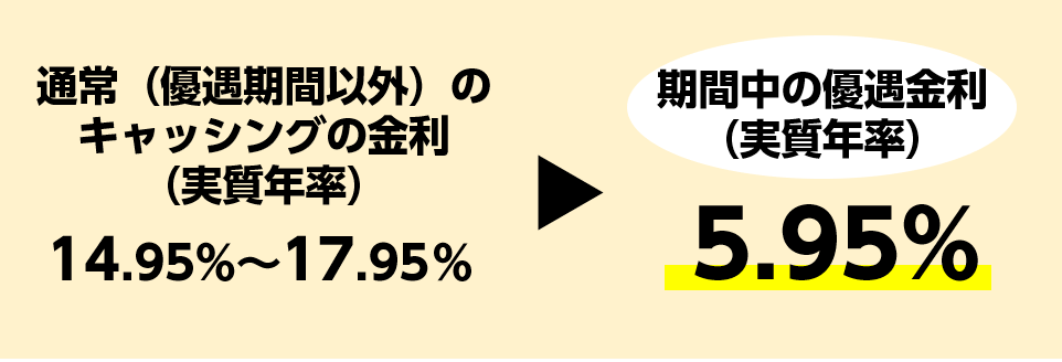 通常(優遇期間以外)のキャッシングの金利(実質年率)は、14.95%~17.95%なのに対し、期間中の優遇金利(実質年率)は、なんと5.95%!