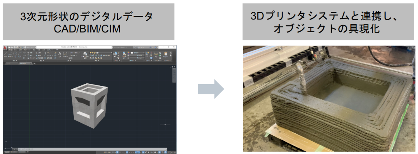 簡単に言いますと、3Dプリンタに三次元デジタルデータを入力すると、建設用3Dプリンタに最適化されたコンクリートを吐出し、最適化した素材の圧送やノズル移動を通して、自動で立体造形ができるというものです。それを建設用に特化し、コスト的・技術的に今までなら実現が難しかった形状にも対応できるよう幅を広げています。