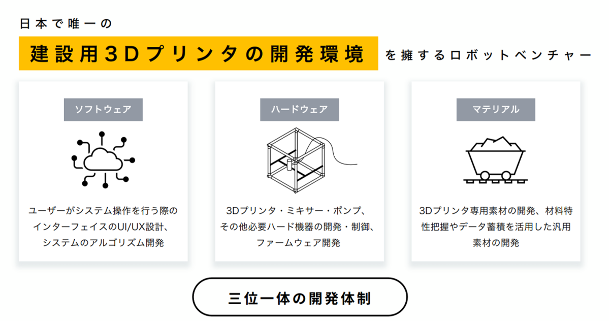 | 事業内容 | 建設用3Dプリンタを中心とした建設業界特化型の技術開発及びサービス提供 |