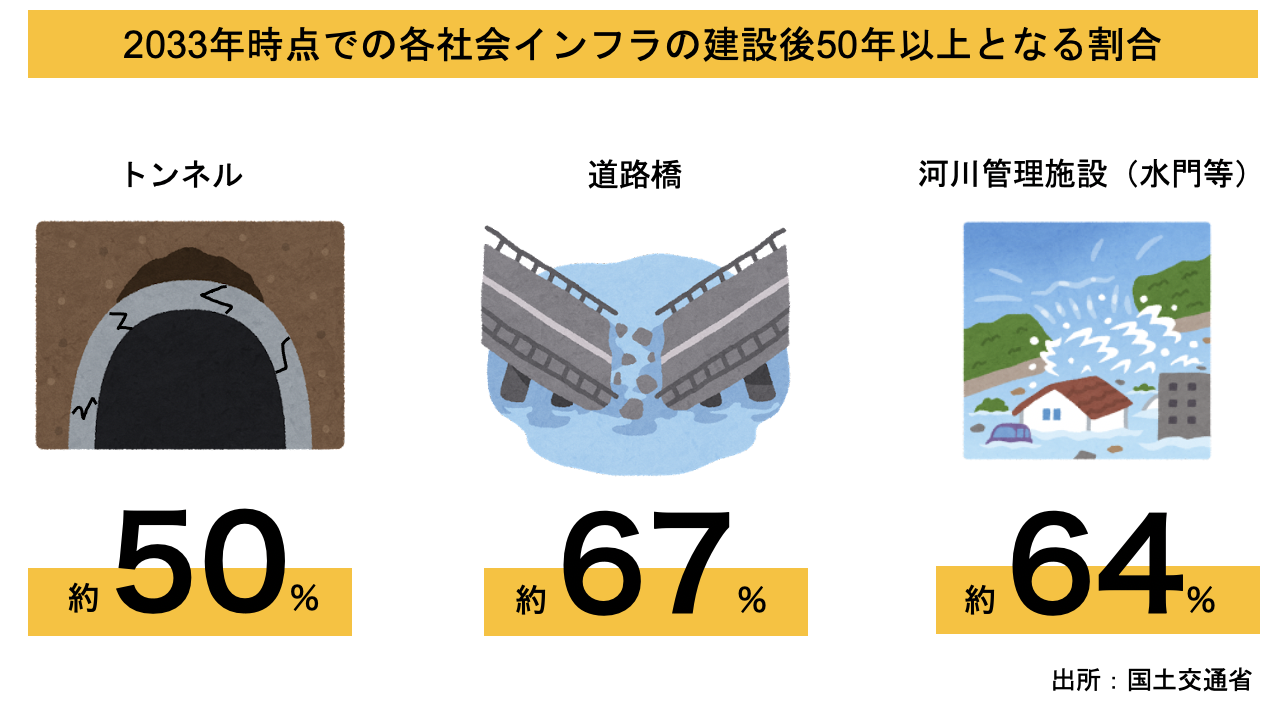 こういったインフラでのコンクリート構造物の耐用年数は一般的に50年とされていますが、日本のコンクリート構造物の多くは高度成長期前後に作られたものが非常に多く、すでに40〜50年以上が経過しています。