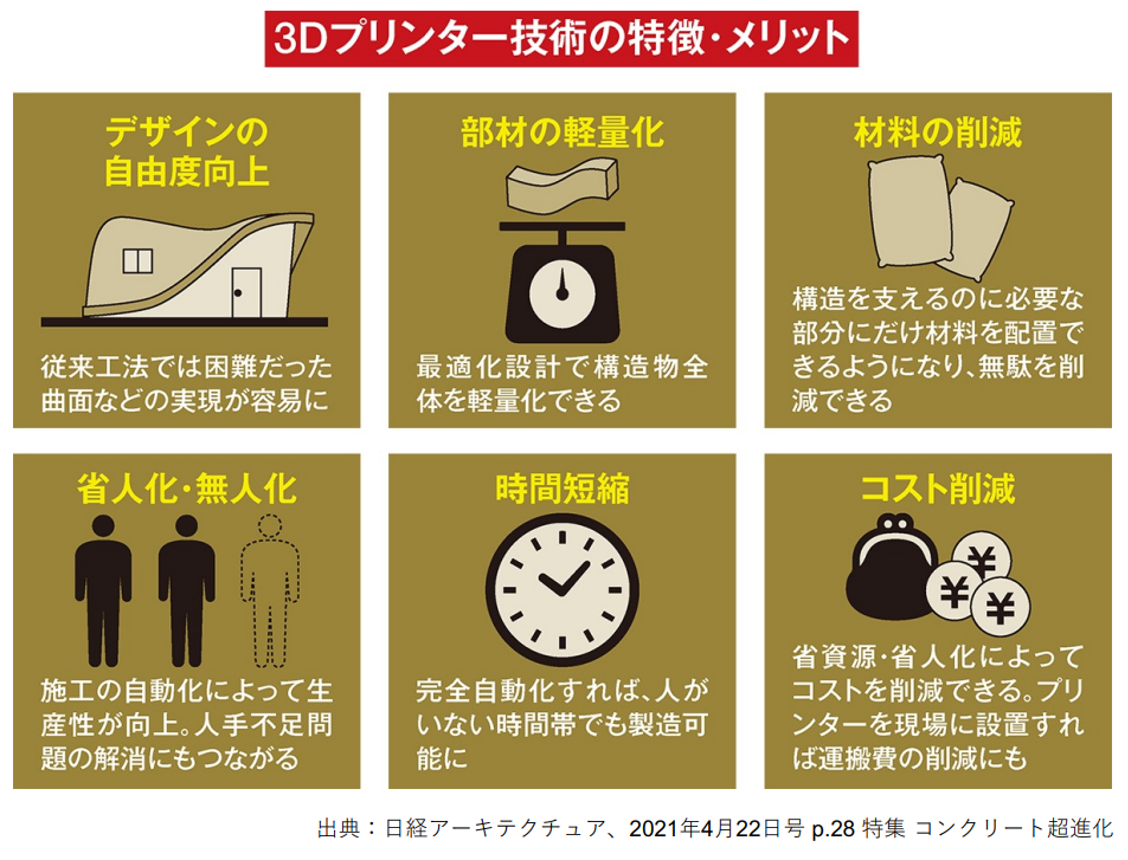 建設用3Dプリンタは、熟練職人でなければ作ることが難しかった多種多様な構造物の製作を若手人材にも担えるようにして、人手不足を解消し工期を短縮するほか、危険な仕事や単純肉体労働を代替し、人でなければできない生産性の高い仕事に職人を再配置できるという点で注目が集まっています。