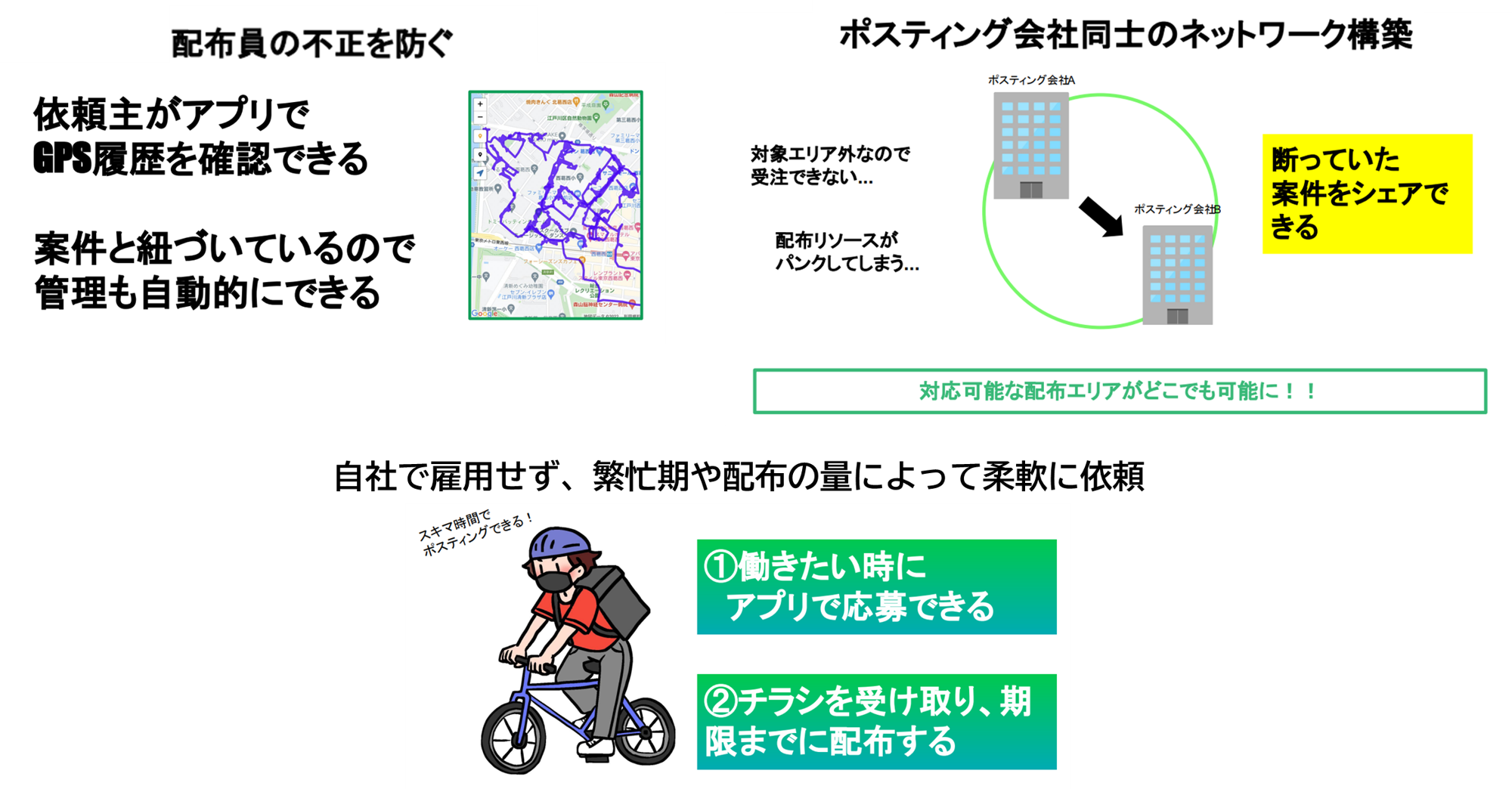 「ポスティングのシェアリングネットワークの構築」と「ポスティング業界のDX化」を実現していることが特徴です。