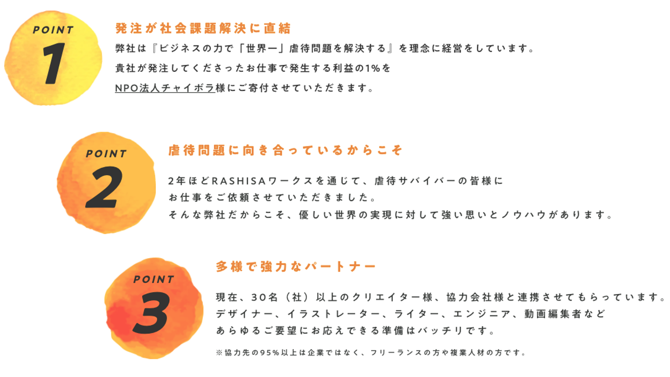 パートナークリエイター様がそのような領域のお仕事に携わってきた点から弊社のRASHISAクリエイティブは「社会課題を解決する事業やダイバーシティ、D&I領域に関わる事業のクリエイティブに強みを持っている」と言えます。
