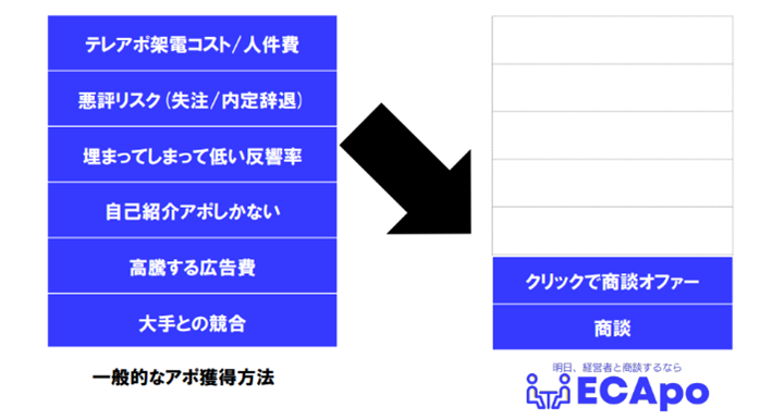 具体的には、月間100件の決裁者アポを取る場合、少なくてもフル稼働できるアポインターが3名は必要ですが、ECApoならフィールドセールスが自身でクリックするだけで決裁者アポイントが獲得できるため、社会問題化している人材不足を解消することができます。