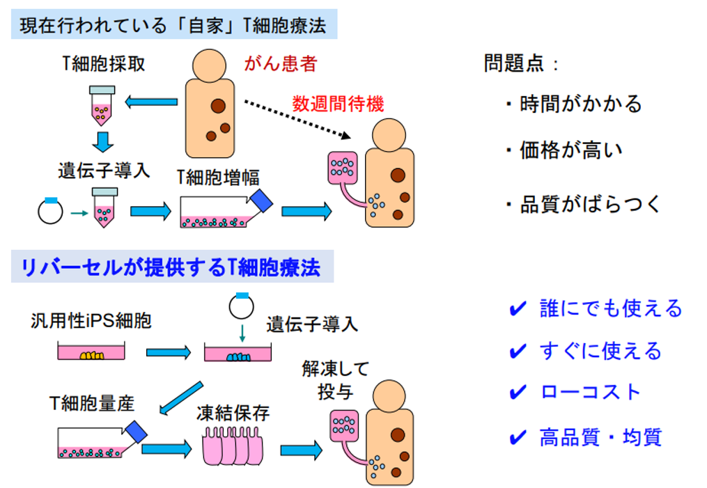 リバーセル株式会社(以下、リバーセル)は、iPS細胞から、「がん細胞」や「ウイルス感染細胞」を選択的に見つけ出して攻撃するキラーT細胞を作成し、現在の標準治療では有効な手段がなく、未だ治療法のない患者群に「他家免疫細胞療法」という新しい治療法を提供することが特徴です。
