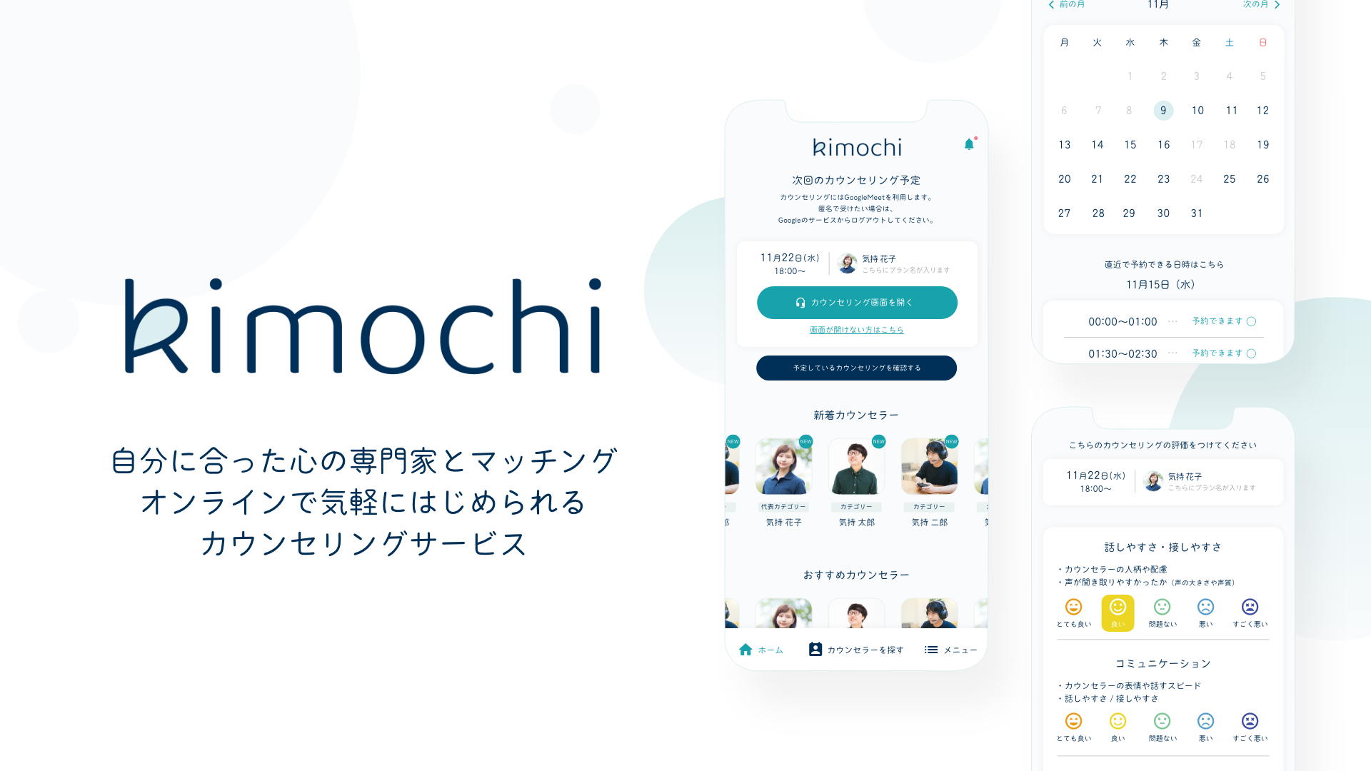 Kimochiは、オンラインカウンセリングを通じて、時間や場所にとらわれない手軽なアクセスを提供し、専門家によるサポートを必要としている人々に届けることができます。