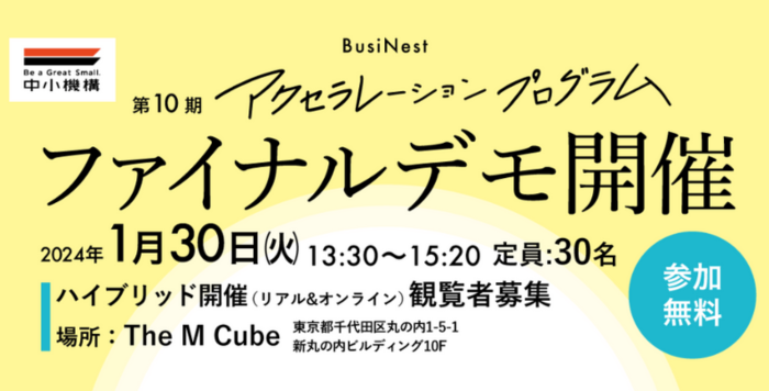 独立行政法人 中小企業基盤整備機構 BusiNest(ビジネスト)が主催する、第10期BusiNest「アクセラレーションプログラム」の参加者によるデモデイ(ファイナルデモ)が、1月30日(火曜)に開催されます。