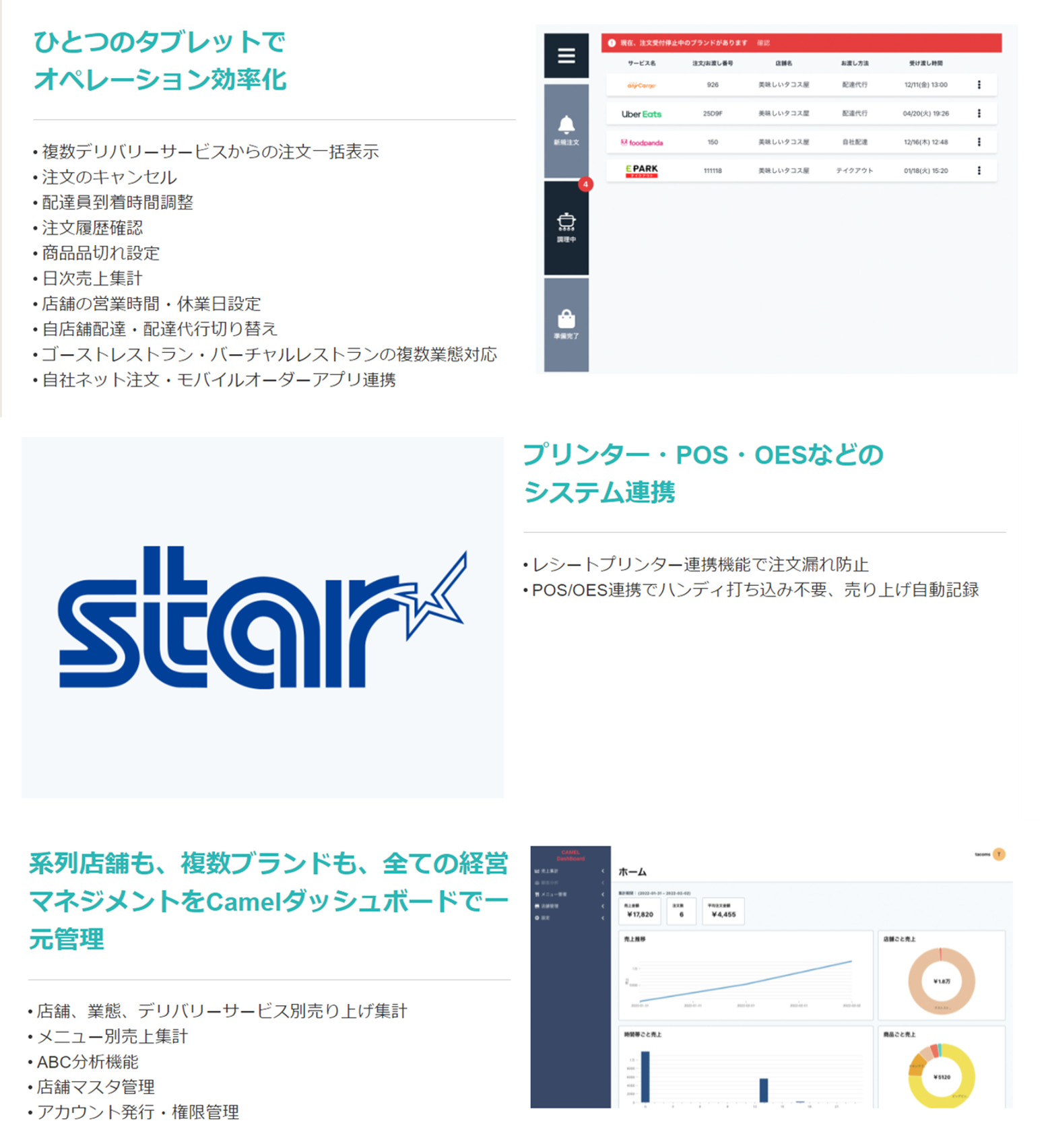 Camelは1台のタブレットで全てのデリバリーサービスの注文受注を可能とし、また店舗のPOSシステムとも連携し売上のシームレスな集計を実現できます。