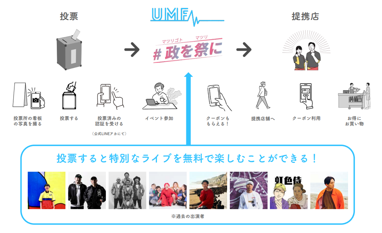 | 事業内容 | 選挙の投票を行うと様々なモノやサービスが無料/割引になる「選挙キャンペーン」を全国の約150店舗のプロジェクト提携者の方々と展開。一般社団法人UMF主催では投票日当日には「投票を行うと無料で楽しめる音楽フェス」も開催しています。 |