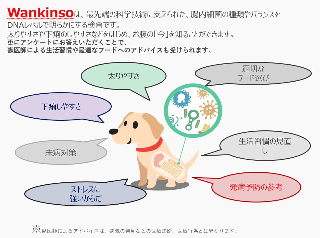 コミュニケーション能力のない動物の体調、未病を、便や尿・涙などの排泄物を活用し、犬や猫が重篤化する前の病気になる前の状況把握であったり、腸内の状態に応じたサプリメントの提供を行っています。