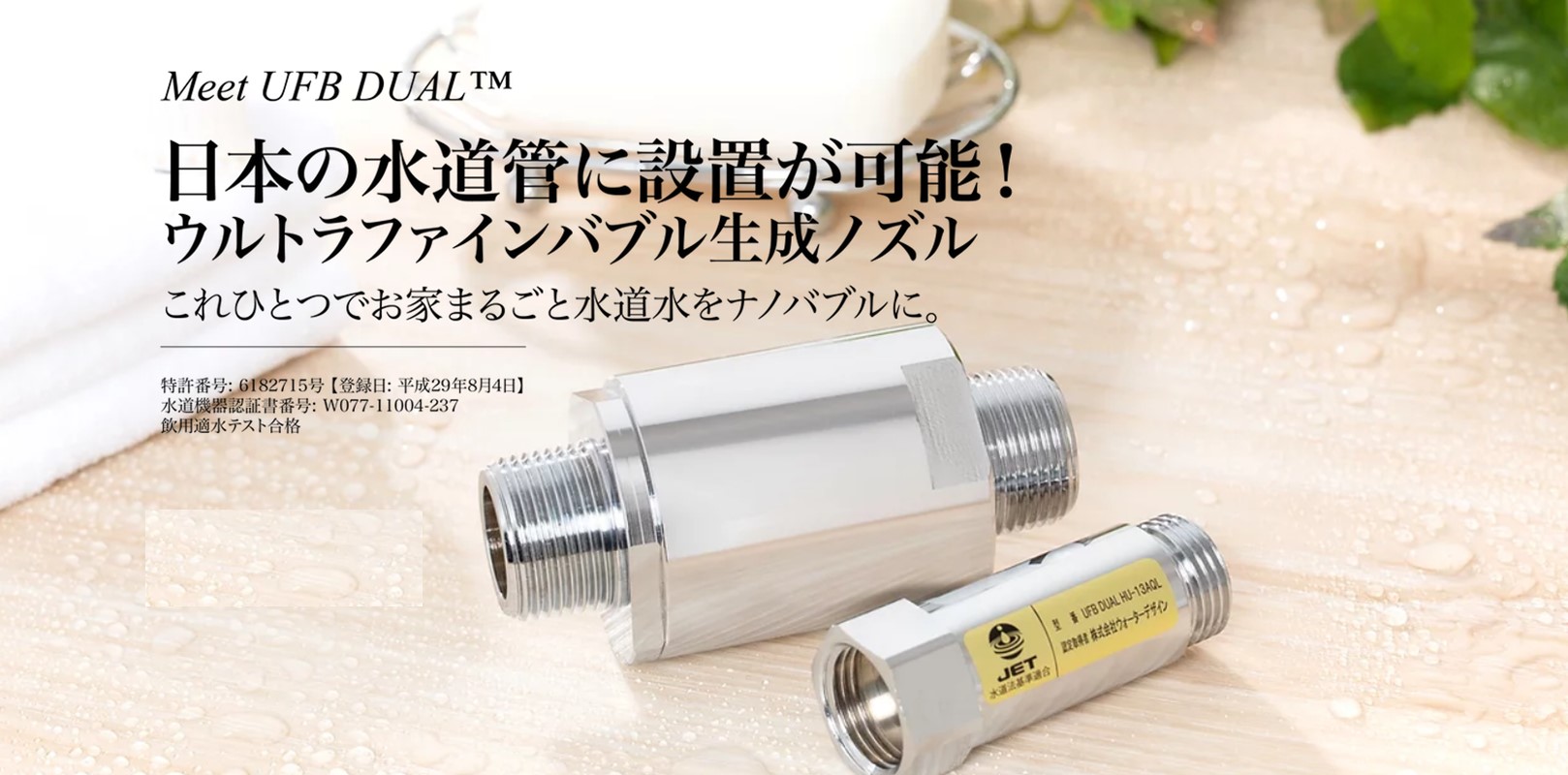 株式会社ウォーターデザインジャパンのウルトラファインバブル生成機事業の特徴は、大変コンパクトに簡単に、あらゆる場所の水道管に装着することが出来るという効率性・普及性に加え、世界初の特許技術として認証を受けたウルトラファインバブル生成技術によって、より一層の安全性と機能性を高められている、という点です。