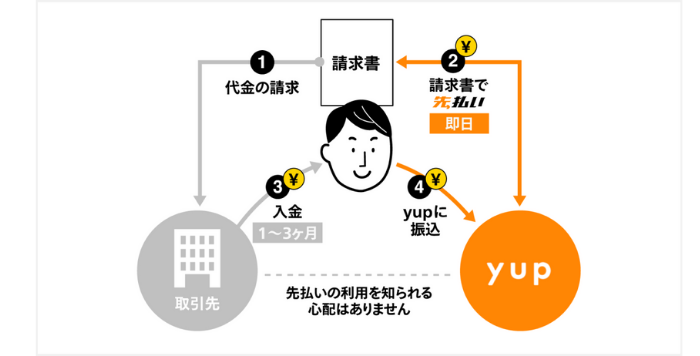 フリーランスが取引先に代金の請求をした場合、入金までに通常1〜3ヶ月程度の時間がかかります。この間に「手元資金がほしい」という時、yup株式会社の「先払い」を使って、取引先に送った入金前の請求書情報を登録することで、報酬を即日最短60分で受け取ることが可能となります。