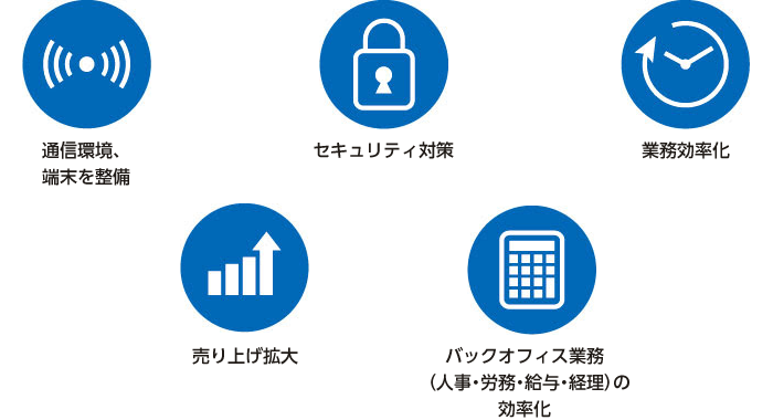 ICT化には主に、「通信環境、端末の整備」、「セキュリティ対策」、「業務効率化」、「売り上げ拡大」、「バックオフィス業務(人事・労務・給与・経理)の効率化」という5種類の領域があります。
