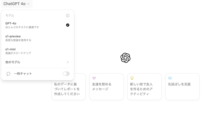 有料プランに登録すると、ブラウザのTop画面の左上で「o1-preview」と「o1-mini」それぞれを選択できるようになります。