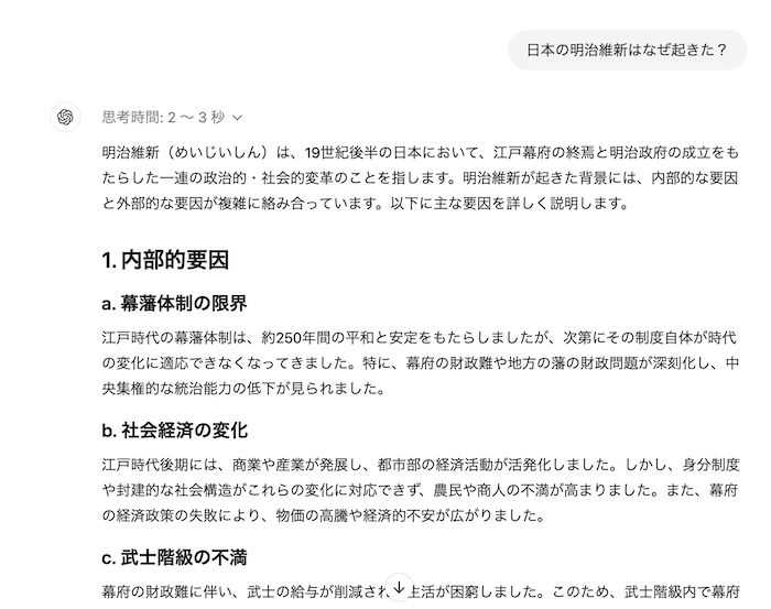 一方、「o1-mini」はより高速に回答できるモデルです。実際に、「日本の明治維新はなぜ起きた?」と問いかけると、わずか2〜3秒で約1,200文字にも及ぶ回答を返してくれました。