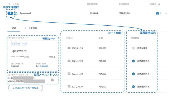 SaaS支払い専用のカードには個別にメール機能が付くので、分散してしまいがち証憑を効率的に回収できるのも魅力のひとつです。