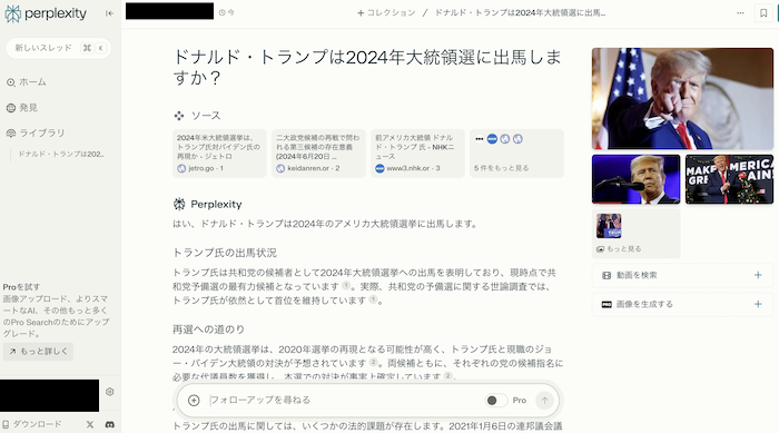 実際に、「ドナルド・トランプは2024年大統領選に出馬しますか?」と質問してみました。