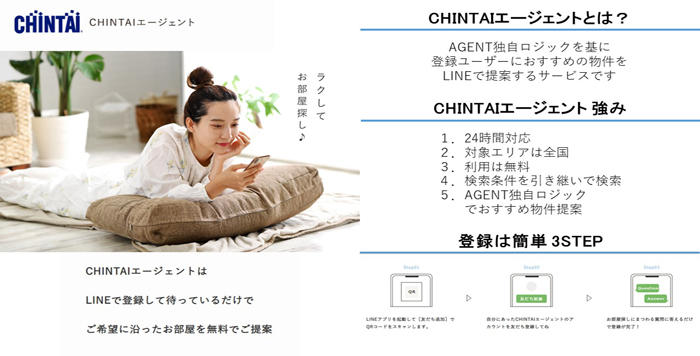 部屋探しのポータルサイト「CHINTAIネット」をはじめ、ひとり暮らしの女性のための「Woman.CHINTAI」、二人暮らし・カップル向けの「ぺやさがし」、賃貸暮らしのお役立ちメディア「CHINTAI情報局」など、住まいに関するさまざまな情報を提供するメディアカンパニー、CHINTAI。