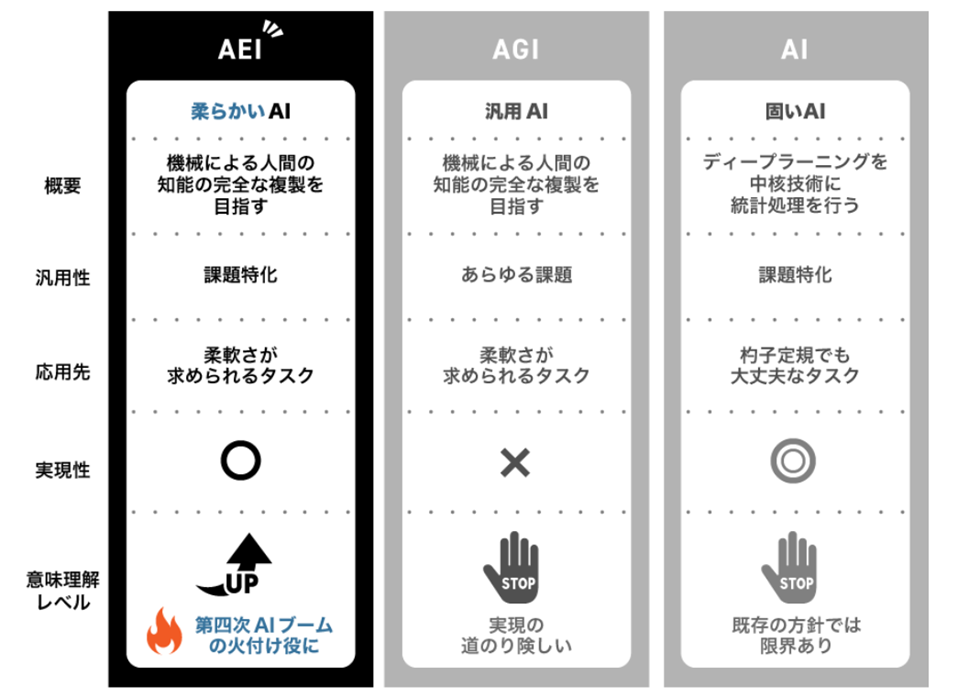 小代:具体的なアプローチ法としては、ディープラーニングやナレッジグラフ(※2)とは異なる「AEI(Artifitial Elastic Intelligence)」という技術コンセプトを独自に掲げ、現実的最適解としての自然言語処理領域のAI開発に取り組んでいます。