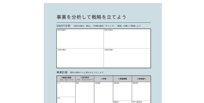 また、冊子版の創業手帳(無料)では、巻末に事業計画書のテンプレートも掲載していますので、すぐに事業計画書を書く実践ができます。公的融資や資金調達などにも使えます。ぜひお試しください。