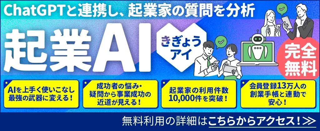 また、「起業AI(無料)」をご用意しました。起業家からの約1万件の質問を分析し、ChatGPTと連携して開発。起業家の「よくある質問」ランキングなどが確認できます。起業時の心配な疑問点を解決するためにぜひご活用ください。