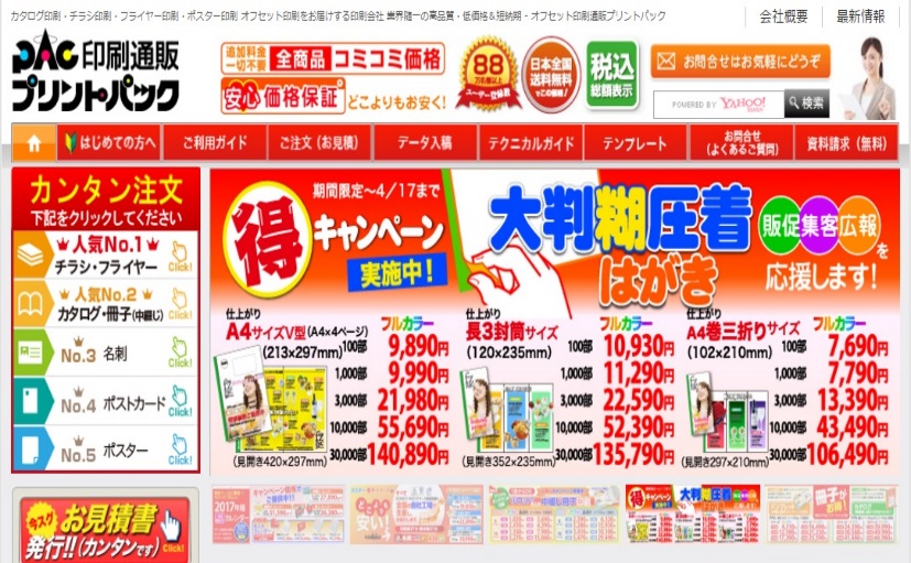 テレビCMなどでご存知の方が多いプリントパックは、印刷通販の老舗で最大手の一角。利用者が多いので情報も手に入りやすい。「印刷通販といえばプリントパックのこと」と思っている人もいる程知名度が高いです。