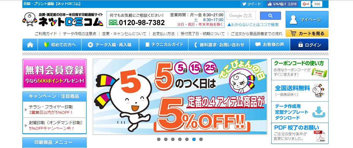 2010年6月にオープンしたネットDEコム。後発である利点を活かし、詳細な他社分析に基づき多くの品目で最安値を設定。価格競争力あり。東京都内の自社工場で入稿から印刷、製本、後工程まで社内一貫制作していて、当日出荷対応可能です。マイページから印刷ビューワーで仕上がりを確認できます。様々なキャンペーンを実施しており、条件によってはかなり格安になる場合もあります