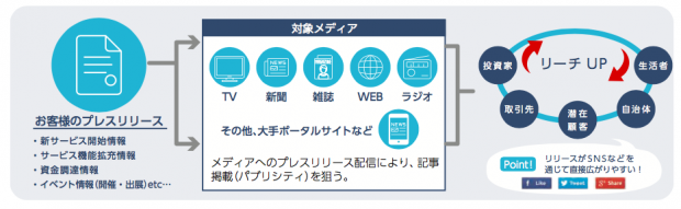 一般的に配信・掲載する情報は、「新商品のリリース」、「新たな事業・サービスの開始」のような、ターゲットが知り得ない新しい情報です。主にテレビ・WEB・新聞・雑誌・ラジオなどの媒体に向けて配信・掲載などをします。