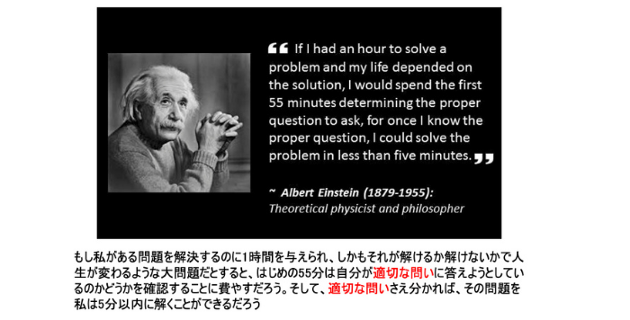 宮本:では、問いに関する著名人の言葉を少しご紹介しますと、アインシュタインは「ある問題を解決するために1時間を与えられたとしたら、最初の55分は適切な問いに答えようとしているかどうかを確認する」と言っています。いきなり問題を解決しようとするのではなく、まずは問題発見をするべきであり、そのために適切な問いが重要だと指摘しています。