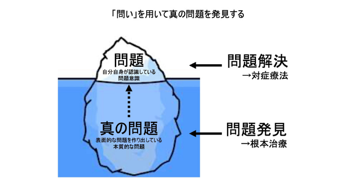 宮本:上の図を見てください。例えば顧客や部下などに解決したい問題があり(水面の上の見えている問題)、それを相談されたときに、実はもっと本質的な問題が隠れていることって高確率であるんです。氷山に例えると、水面下に本質的な問題が隠れているということですね。
