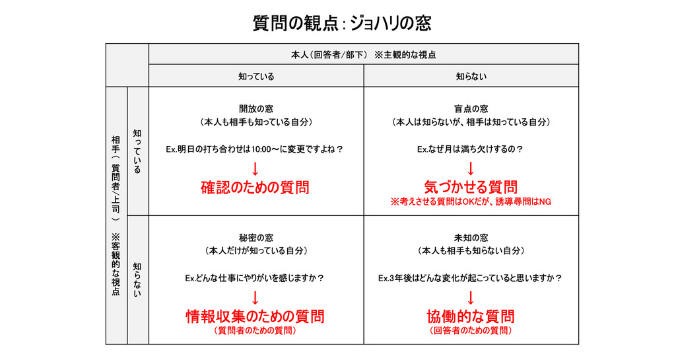 我々が大切にしているのは右下の「未知の窓」で、「本人も質問者も知らない」内容の質問です。問う側は、必ずしも答えを持っていなくていいんです。「この観点はどう?」「あなたならどう考える?」という、双方が一緒に考える質問ですね。考えるきっかけになりますし、問われる側が自分で気づける方が大事なのです。