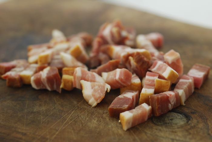 ベーコンを5mm角程度の長方形にカットします。ここではベーコンブロックを使用していますが、スライスなどでも構いません。