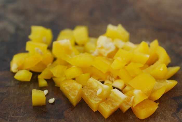 パプリカを1/4程度切り出し、玉ねぎと同程度の大きさにさいの目切りします。パプリカはピーマンよりも肉厚で甘みが強いため、ベーコン料理にとてもよく合います。もちろん赤パプリカを使っても構いません。
