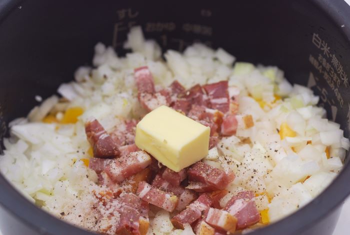 今回はお米3合分なので、同量よりも気持ち少なめ程度の水を使用しました。炊飯器によっては規定量の水ですと仕上がりが水っぽくベチャッとなってしまう場合があります。これは玉ねぎやパプリカなど使用する野菜から出る水分により、水気が過剰になってしまうのが原因です。そのため野菜をたくさん使う場合は、規定量よりも気持ち少なめの水を使うのがポイントです。