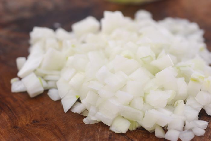 玉ねぎを粗みじん切りにします。あまり細かくカットする必要はありません。ザクッザクッと大胆にカットしてください。