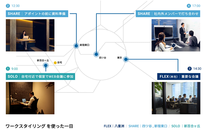 例えば、9時に自宅付近のワークスタイリング SOLOでWEB会議に参加し、12:30に新宿のワークスタイリング SHAREで資料準備、14:30に本社のあるワークスタイリング FLEX八重洲で会議に出席した後、17:00に四谷のワークスタイリング SHAREで社内外のメンバーと共に打ち合わせ。