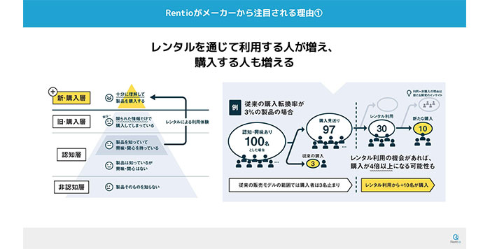 三輪:創業時からメーカーにアプローチして、提携を提案してきました。レンタル事業をやる中で、「レンタルが増えれば購入・消費も増える」という実感を得たからです。レンタルして、使用感を試したユーザーは、そのまま商品を購入する確率がぐっと高くなります。これは弊社に蓄積されたデータが証明しているので、メーカー側に提携のメリットを示す上で大きなアドバンテージになります。
