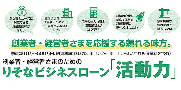 続いては、創業者・経営者を応援する頼もしい味方となる、りそなビジネスローン「活動力」のご紹介です。