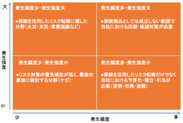 発生頻度も少なく、発生した際の損害も小さいものであれば、リスクマネジメントの対策としては、最後に検討する内容になります。利益に甚大な影響を与えるものでなく、経常利益の範囲内で対応出来る間は、優先順位は低くても構わない分野です。