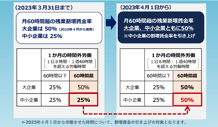 労働基準法の改正により、2023年4月1日から月60時間超の時間外労働に対する割増賃金率が50%に引き上げられます。この改正により、一部の中小企業は人件費負担が大きくなるので注意が必要です。